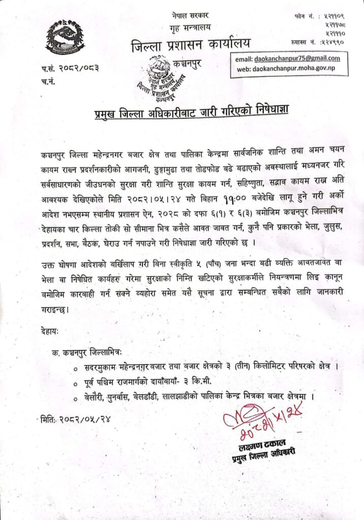महेन्द्रनगर – कञ्चनपुर जिल्ला प्रशासन कार्यालयले महेन्द्रनगर बजार क्षेत्र र अन्य पालिका केन्द्रहरूमा मंगलबारदेखि निषेधाज्ञा लागू गरेको छ ।
